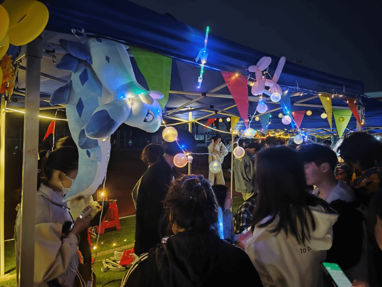 活动当天,夜幕降临,华灯初上,操场内的夜市摊位逐渐热闹起来。各式各样的摊位琳琅满目,有碎片成诗、有蒙眼挑战、还有射击气球。同学们纷纷驻足观赏,流连忘返。