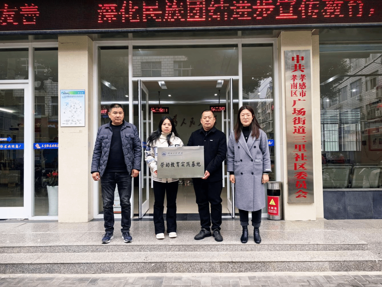 11月19日上午,物电学院党委副书记黄文娟带队,赴孝感市孝南区广场街道三里社区签订《劳动教育实践基地建设协议书》。