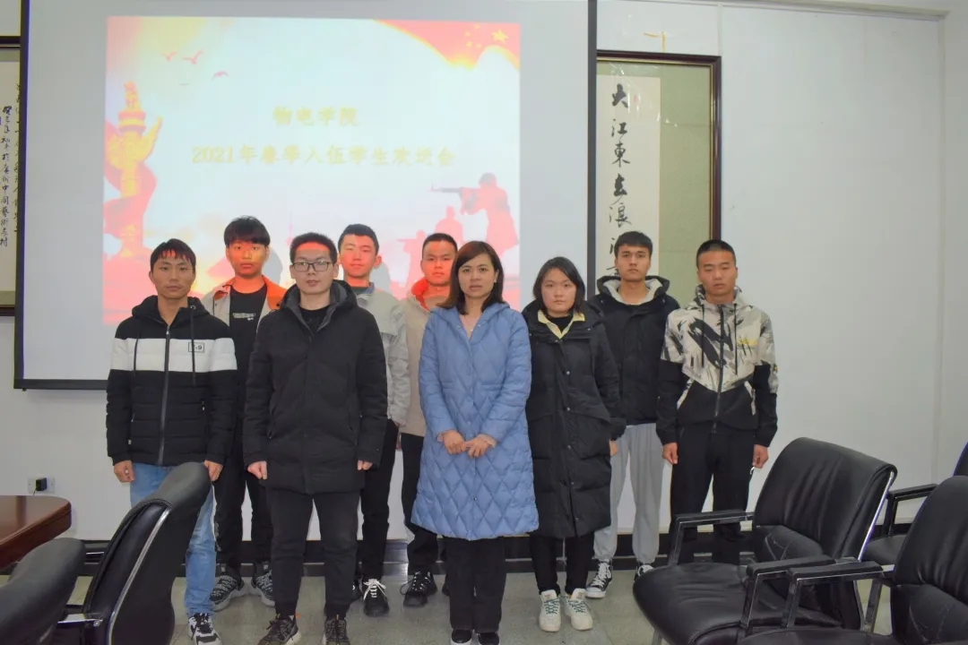 3月5日下午,tyc7111cc太阳成集团2021年春季大学生应征入伍欢送会在格物楼209会议室举行。物电学院党总支副书记许幸子、征兵工作辅导员贾岩、入伍新兵、学生代表参加了欢送会。许幸子主持欢送会。
