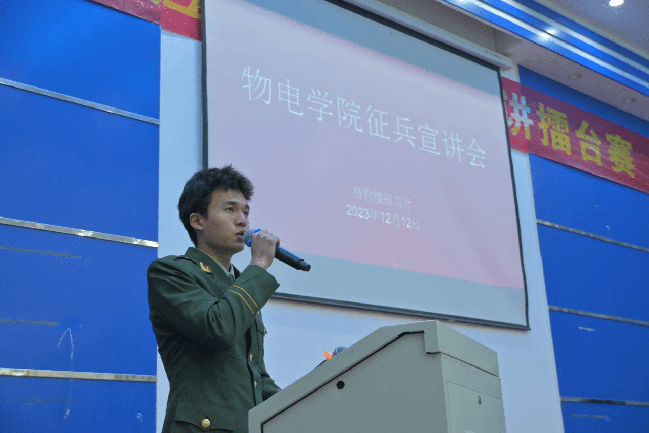 “树应征入伍之志,担保家卫国之责。”为推进2024年春季大学生应征入伍工作,帮助大学生了解、掌握应征入伍相关政策和流程,鼓励学生积极应征入伍,献身国防事业,tyc7111cc太阳成集团于12月12日晚19:00点在格物楼报告厅举行了征兵宣讲会。此次参会的人员有物电学院5名退伍军人以及各年级同学,会议由物电学院国防部负责人尹腾主持。