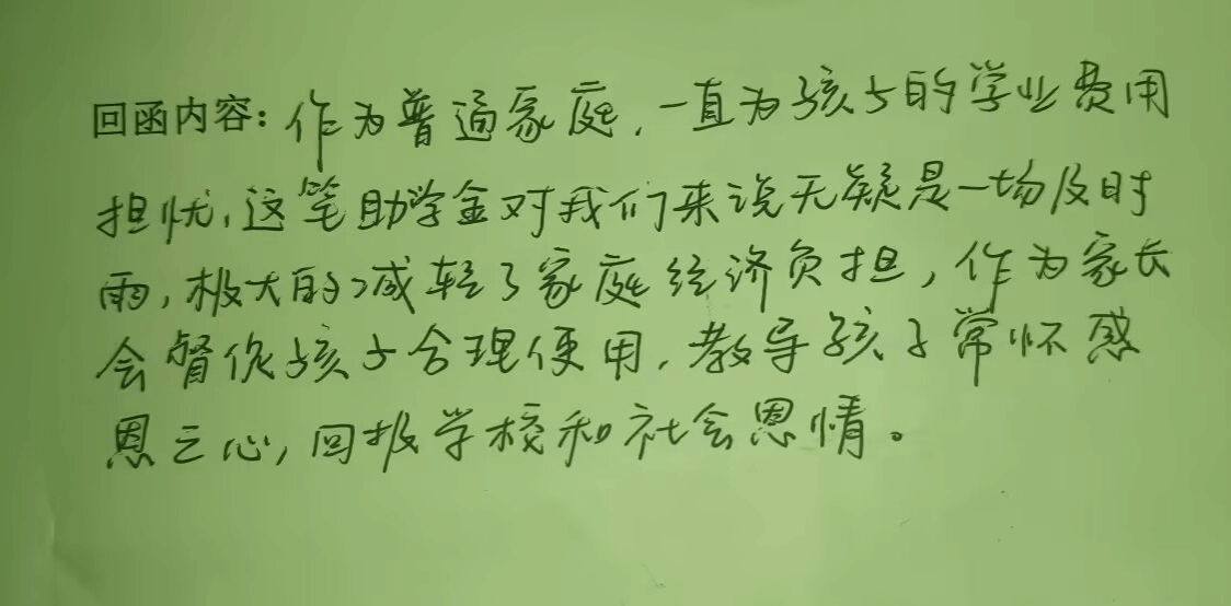 在回函中,家长们首先对国家助学金制度表示由衷的赞赏。他们认为,这一制度不仅为家庭经济困难的学生提供了实质性的帮助,更让他们感受到了来自学校的温暖与关怀。一位家长表示:“作为普通家庭,一直为孩子的学业费用担忧,这笔助学金极大的减轻了家庭的经济负担。”
