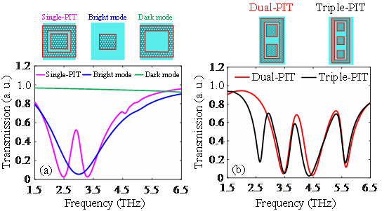 等离子体诱导透明(Plasmon Induced Transparency, PIT)效应是原子系统中电磁诱导透明(Electromagnetically Induced Transparency, EIT)效应与等离子体相结合的一种光学现象,其可以通过不同光学路径光波模式之间的相干干涉作用实现。随着大规模集成PIT光子器件的发展,研究具有简单连续结构下的动态可调谐、大的群折射率、低功耗的多PIT效应及慢光显得非常重要。该论文提出了一种基于矩形间断石墨烯阵列的太赫兹平面超材料新型结构系统,研究了纳米量级尺寸、动态可调谐和多频带的PIT效应及其慢光特性。该论文正确的推导了n重PIT耦合模式理论方程,并且揭示基于石墨烯平面超材料结构、等离激元局域光场和PIT效应慢光的协同增强作用机制,阐明明暗模式耦合机制实现动态可调谐的多PIT效应及慢光的物理机理。采用偏置电压动态的调谐石墨烯的费米能级,在1.5 THz到6.5 THz频率范围内,实现了PIT透射光谱和群折射率的动态连续可调谐。当石墨烯的费米能级从0.7 eV调谐到1.1 eV时,2重PIT系统的群折射率从475.1变化到801.6,并且3重PIT系统的群折射率从583.3变化到886.3。当石墨烯的费米能级为1.1 eV时,该论文提出的单层石墨烯超材料系统获得最大群折射率为886.3,相比于传统的慢光器件,该石墨烯超材料系统能够实现优秀的慢光效果。这一论文得到了评审专家的高度肯定,如评审意见指出“This article has general applicability for multiple PIT effects in specific structures, and the innovation points are very good.” 该论文提出的太赫兹石墨烯平面超材料结构系统,有望在多功能光电器件(超紧凑慢光和光存储器件、超快光开关)和下一代片上集成光电子学等方面取得重要应用。