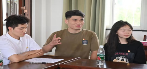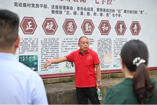 在村口“七字经”文化墙前,袁少敏热情迎接大家,并带队参观党建文化长廊。他风趣又真挚地讲解:“这七个字——正、硬、愚、勤、和、善、责,不是写着好看,而是我们党员干部每天对照的‘家规’。”走在村里的“乡村大舞台”前,他指出身边一圈由废旧轮胎改造的景观:“我们这里从不搞花架子,生态建设靠的是真心和巧思,变废为宝,既环保又亲民。”走到村中心的 “乡村大舞台” 前,他特别分享了“党员舞台论”:“党员要主动亮身份,就像演员站上舞台,有了关注和期待,才会更自觉地演好‘服务群众’这场戏。”这种接地气、冒热气的比喻引得在场同学们频频点头。