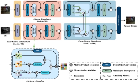 针对传统深度学习图像融合方法容易造成低频细节信息丢失,以及模态间自适应交互机制不足、难以充分保留各自模态固有特征等问题,研究团队提出了一种基于线性注意力 Transformer 的图像融合新方法。该方法创新性地构建了基于辅助矩阵的线性注意力机制,用以替代传统自注意力结构,在显著降低计算复杂度的同时,增强了对异构模态互补信息的自适应建模能力。此外,团队设计了基于局部注意力的多尺度细粒度特征增强模块,有效强化了图像的局部结构与纹理表达,显著提升了融合结果的清晰度与结构保真度。实验结果表明,该方法展现出优异的融合性能和良好的应用前景。