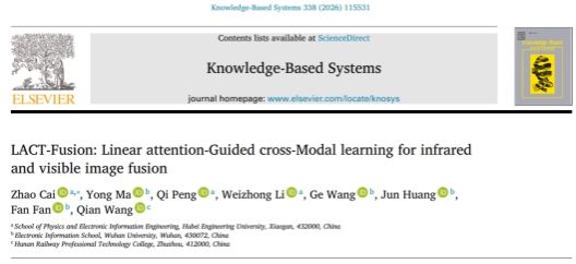 近日,Elsevier旗下人工智能领域国际权威期刊《Knowledge-Based Systems》(KBS)(中国科学院SCI一区Top,JCR一区,CCF推荐期刊,2025年影响因子7.6)发表了我校机器视觉科研团队在图像融合领域取得的最新研究成果——LACT-Fusion: Linear Attention-Guided Cross-Modal Learning for Infrared and Visible Image Fusion。论文第一作者和通讯作者为物电学院蔡朝副教授,我校为第一署名单位。