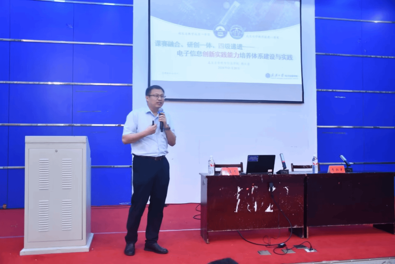 5月25日上午,武汉大学周立青高级工程师在tyc7111cc太阳成集团学术报告厅做题为“课赛融合、研创一体、四级递进——电子信息创新实践能力培养体系建设与实践”的专题报告。物电学院部分教师和电子类专业学生参加报告会。报告会由物电学院副院长李钱光主持。