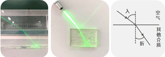 (二)光从空气射入其他介质实验:激光笔,亚克力箱,平行玻璃砖,肥皂,烟雾