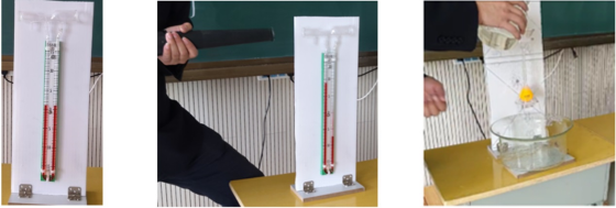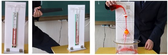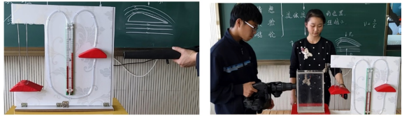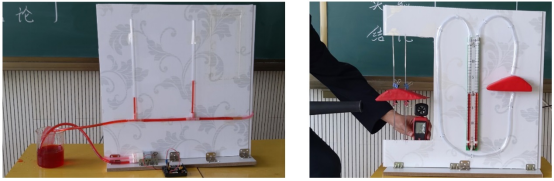 4.自制液体流速演示器使学生加深流体压强与流速关系,现象明显比传统实验效果更好,并具有可持续性,让学生领会了连通器里液体的液面,并不是永远一样高,只有静止在连通器里的液体,液面的高度才是相同的,从而带给学生更多的启发和思维。