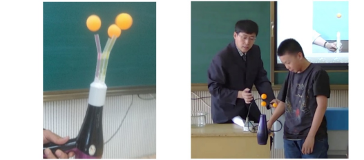 教具设计:将PVC管制成T字型,做成内径比乒乓球直径略粗的T字圆筒,从下方放入乒乓球(如图3)。