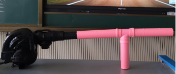 教师演示:将乒乓球放入T型PVC管下端、在上端打开吹风机吹气完成“空气炮”实验。